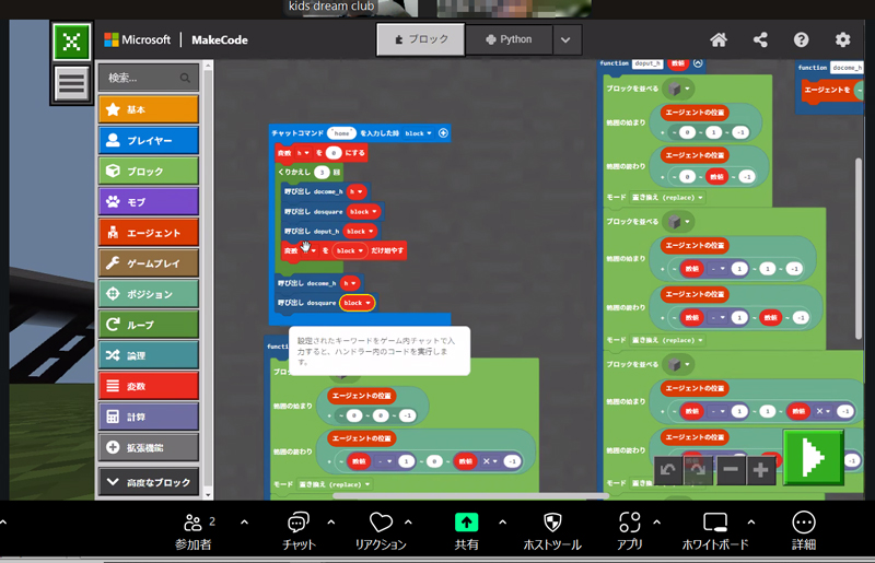 レッスン内容としては、ビルの柱を作った後に階段をつけるところを考えてもらいましたが、途中で向きが変わるので、初めは変数を使わずに固定の数字で考えてもらったほうが分かりやすいかなと感じています。みなさん、この課題は苦戦しているので、4コマ数はぐらいかかりそうです。