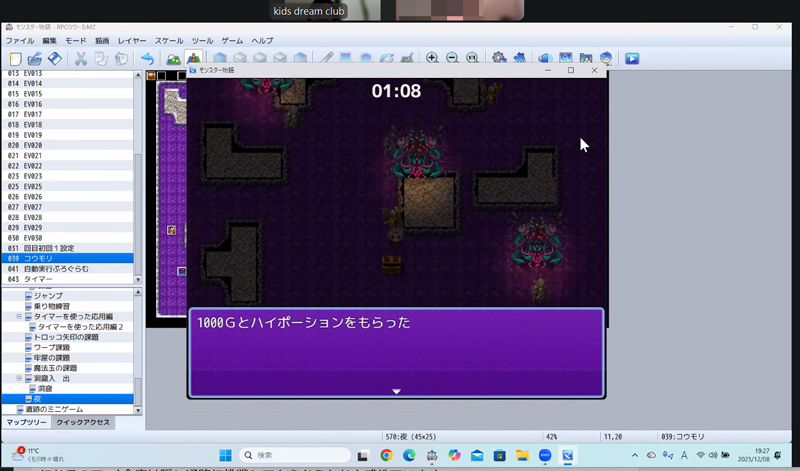 物語システムコースでは、見える罠と見えない罠を作ってもらいました。(見える罠だとゲームが簡単になるので。)今度は隠し通路に挑戦してもらおうかなと感じています。もう一人の子については、モンスターにも灯りの設定を追加して、モンスターに捕まらないに逃げ回る鬼ごっこみたいなプログラムを作ってもらいました。