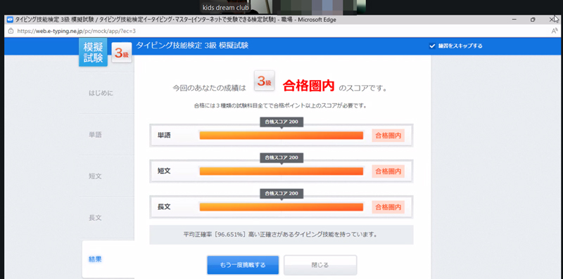 昨日の午前中や午後は業務連絡やカリキュラム作りが中心で、夕方からはオンラインレッスン(1件)を行いました。タイピング検定(模擬)については、3級ではもういうことなしのレベルだったので、これからは2級に向けての取り組みが中心になるのかなと感じています。